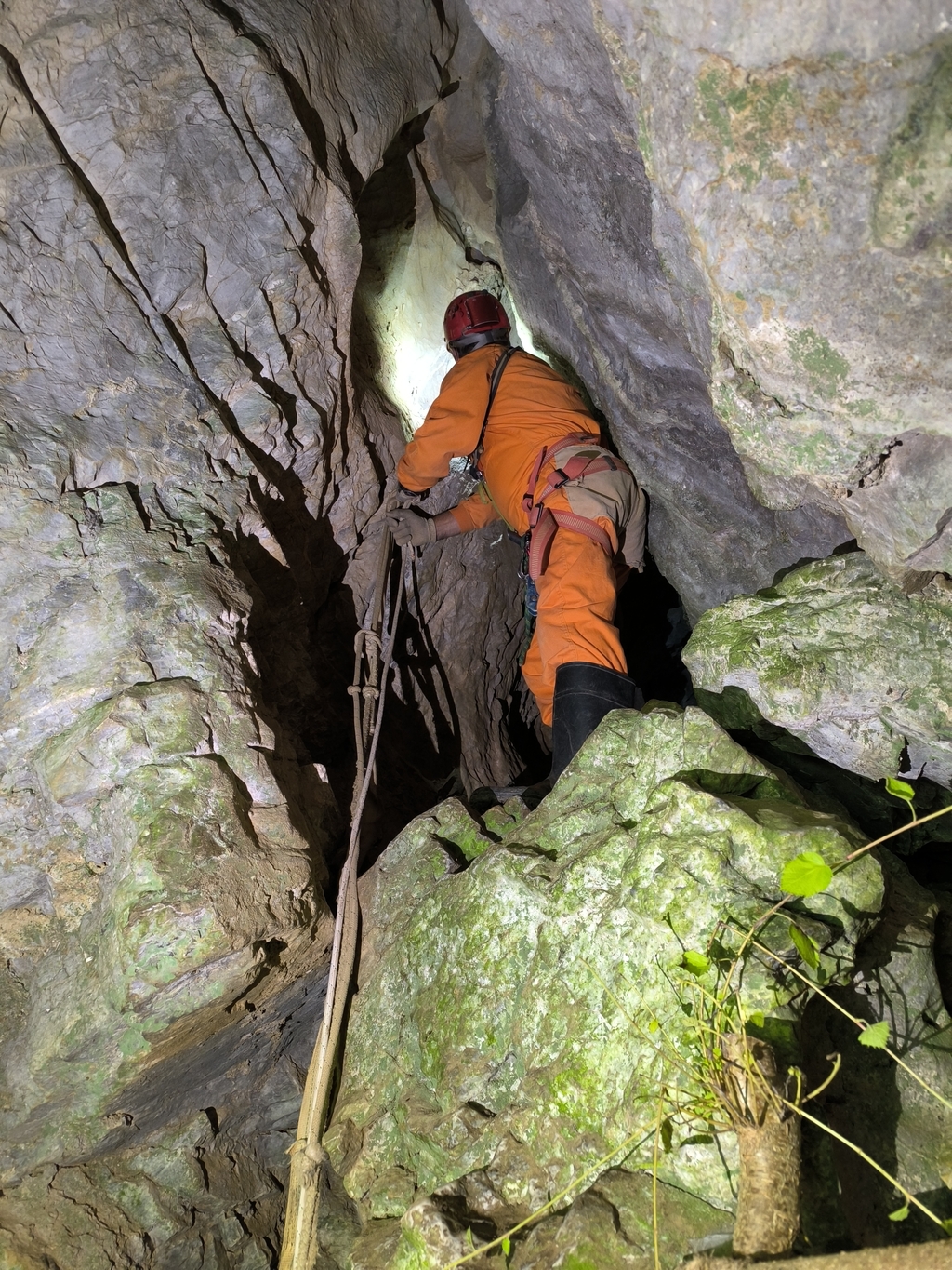 Per aquí accedim a una diàclasi, als 3 metres trobem un (r-2,90), que baixarem sense problemes, aquí el sostre el tenim a 6 metres d'alçada i l'amplada és de 0,70 metres.