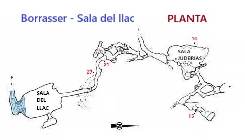 Al fons de la Sala del Llac trobem un nivell d'aigua que continua per una galeria que gira cap a l'O i fineix al 6 metres en un estret engolidor.