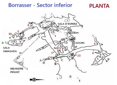 Aquí a la dreta, un petit meandre ascendent es fa impracticable als 3 metres, i a l'esquerra avancem 3 metres per interceptar una altra galeria que a la seva esquerra fineix als 5 metres.