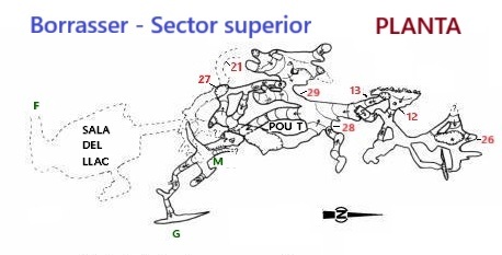 La via directa a l'esmentada sala, seria pujar el (r+2,20) de la Bauma Principal, ascendim per una galeria uns 3 metres fins a interceptar l'altra galeria (L), a l'esquerra podrem avançar uns 10 metres més.