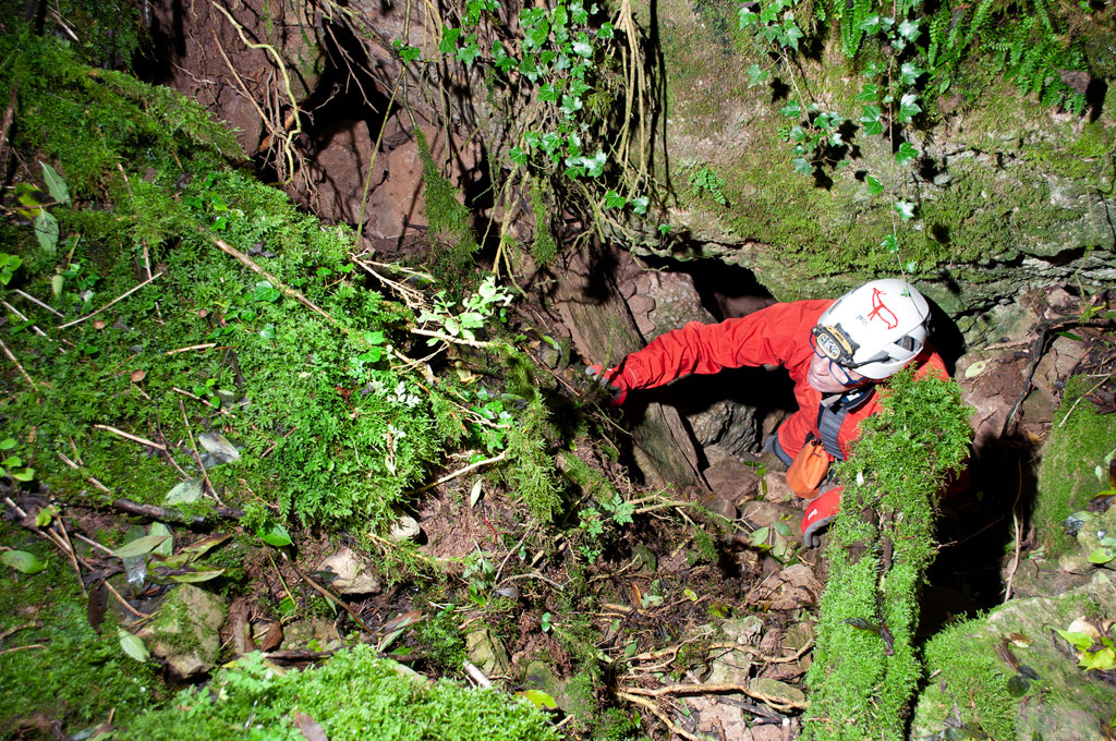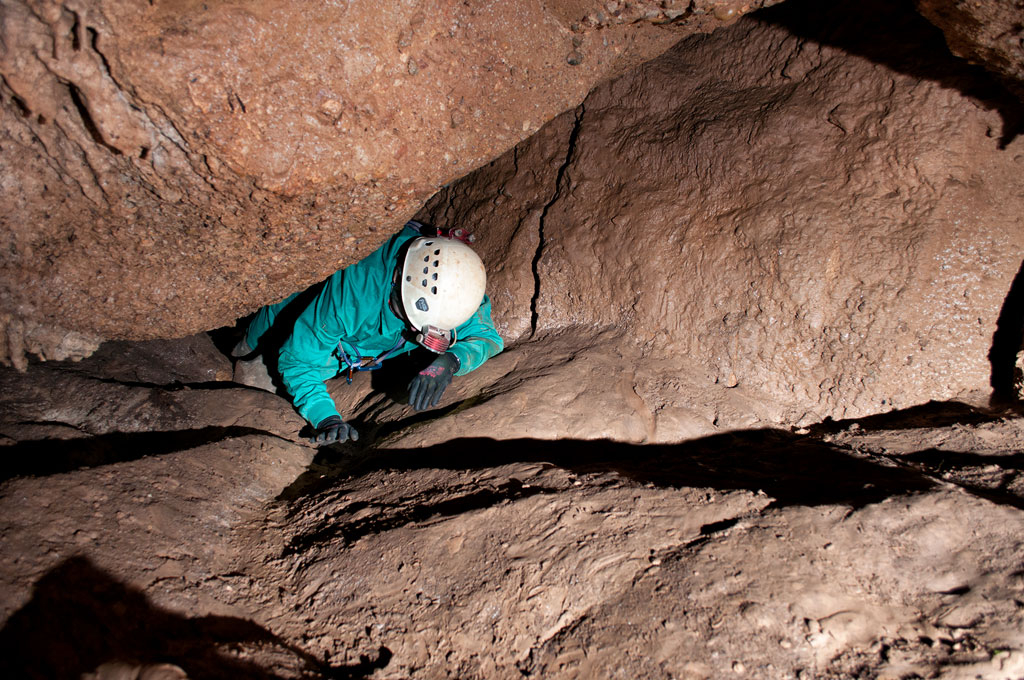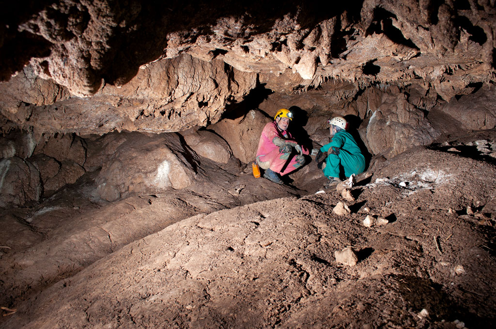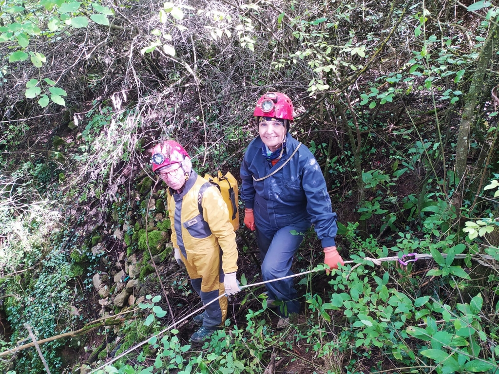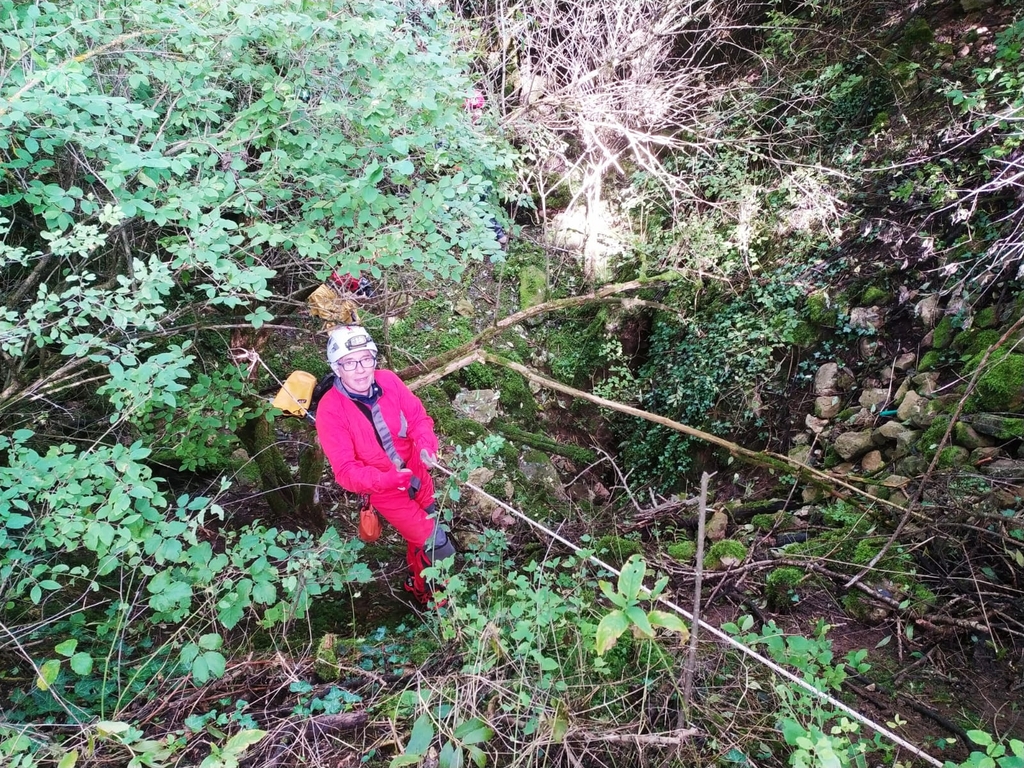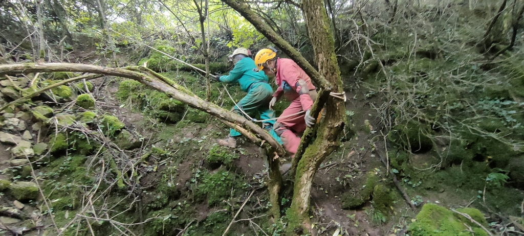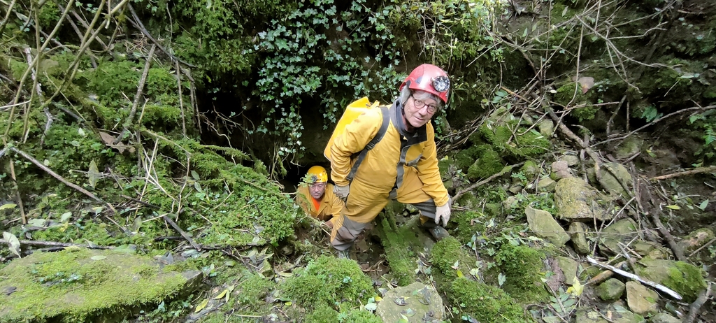Hi ha una petita rampa fangosa per baixar l'esfondrament, on vam instal·lar una corda.