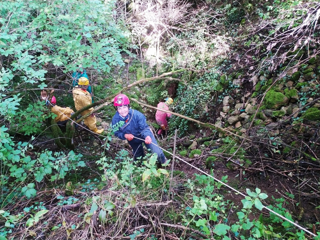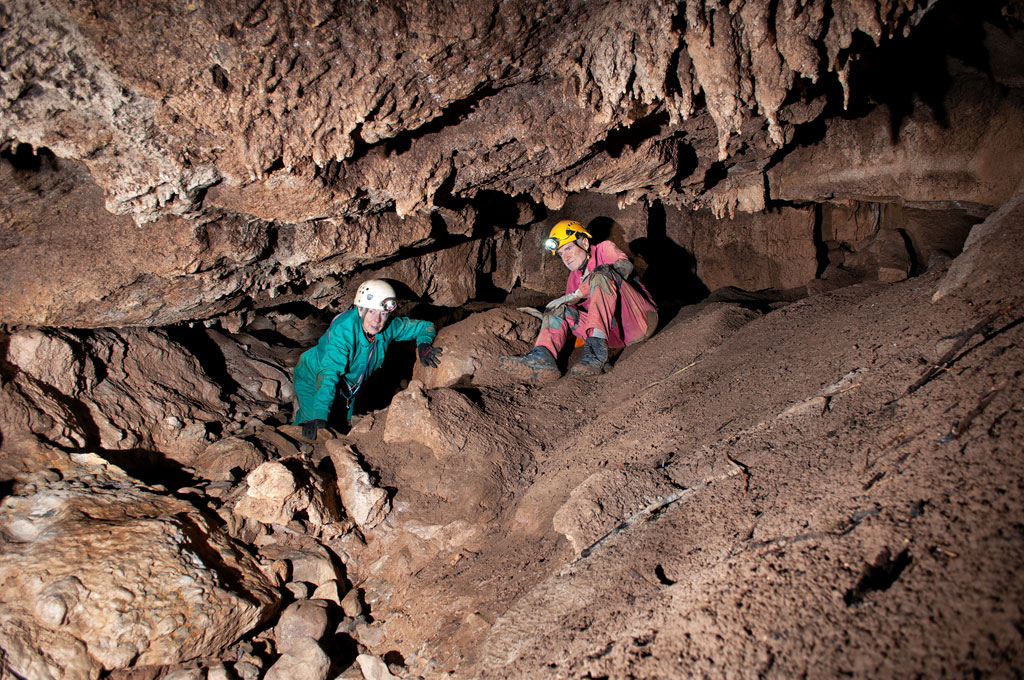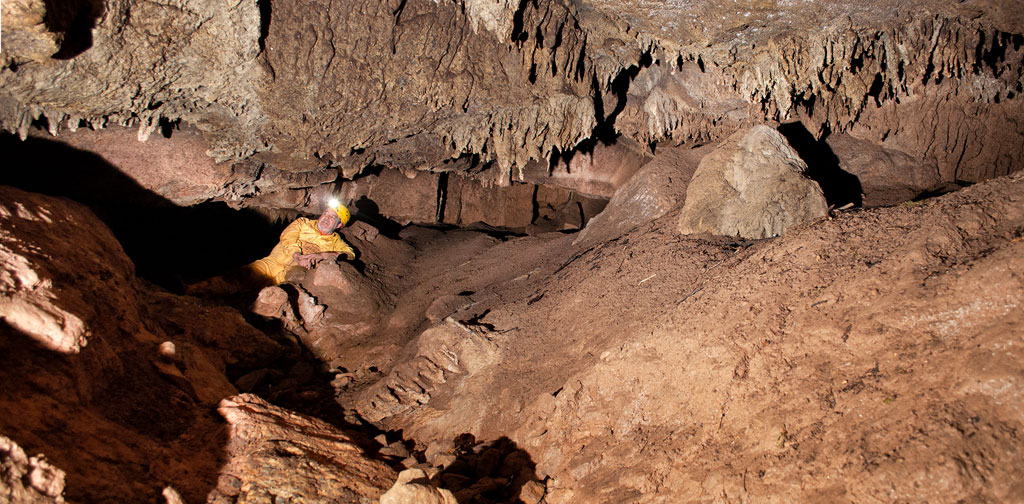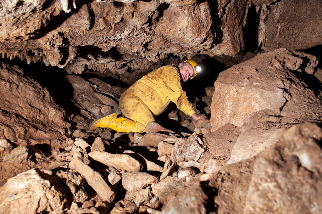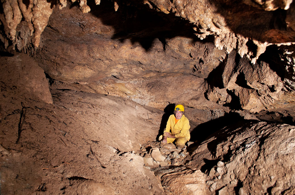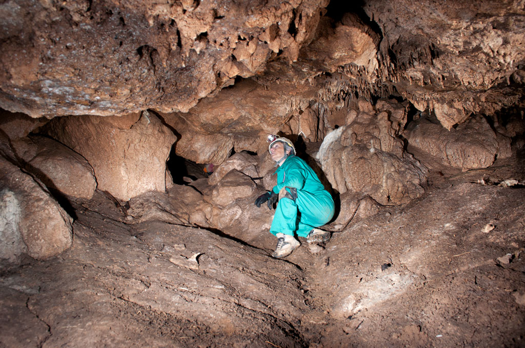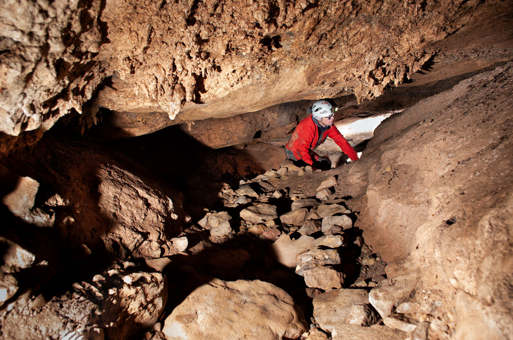 Hi ha una petita rampa fangosa per baixar l'esfondrament, on vam instal·lar una corda.