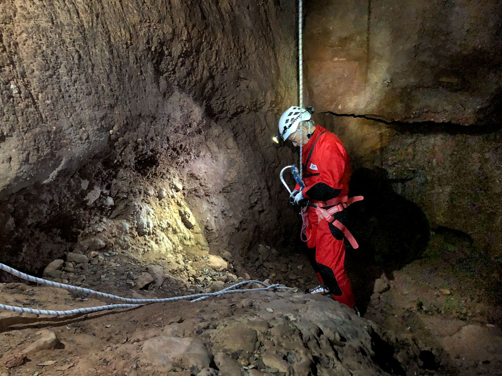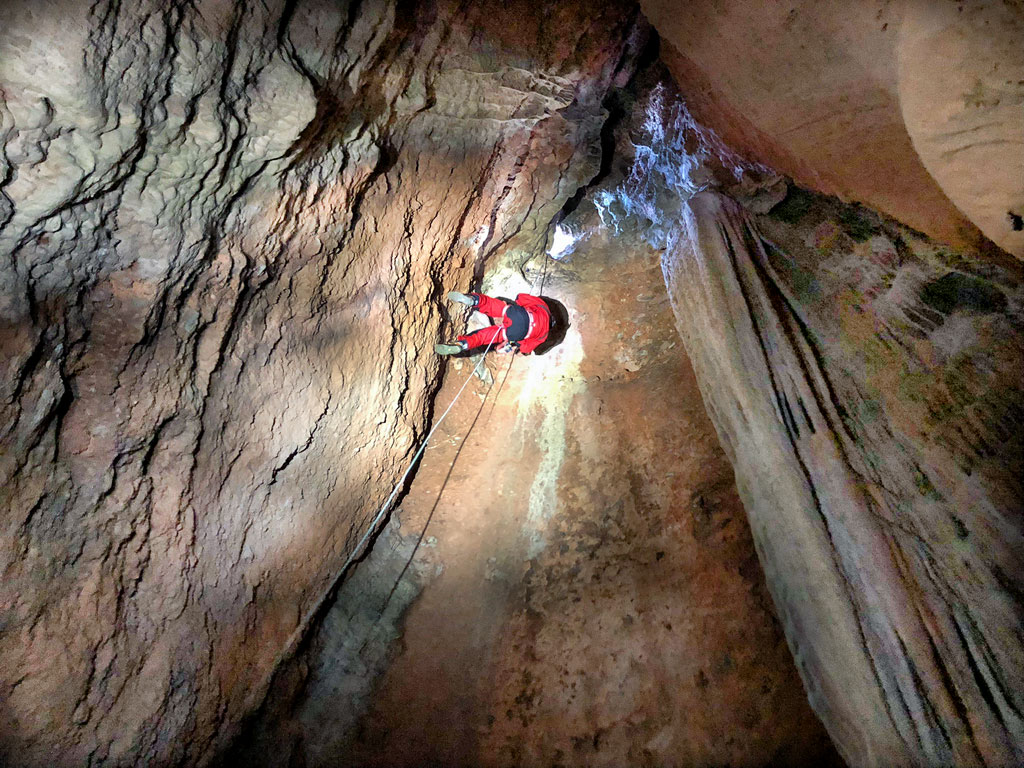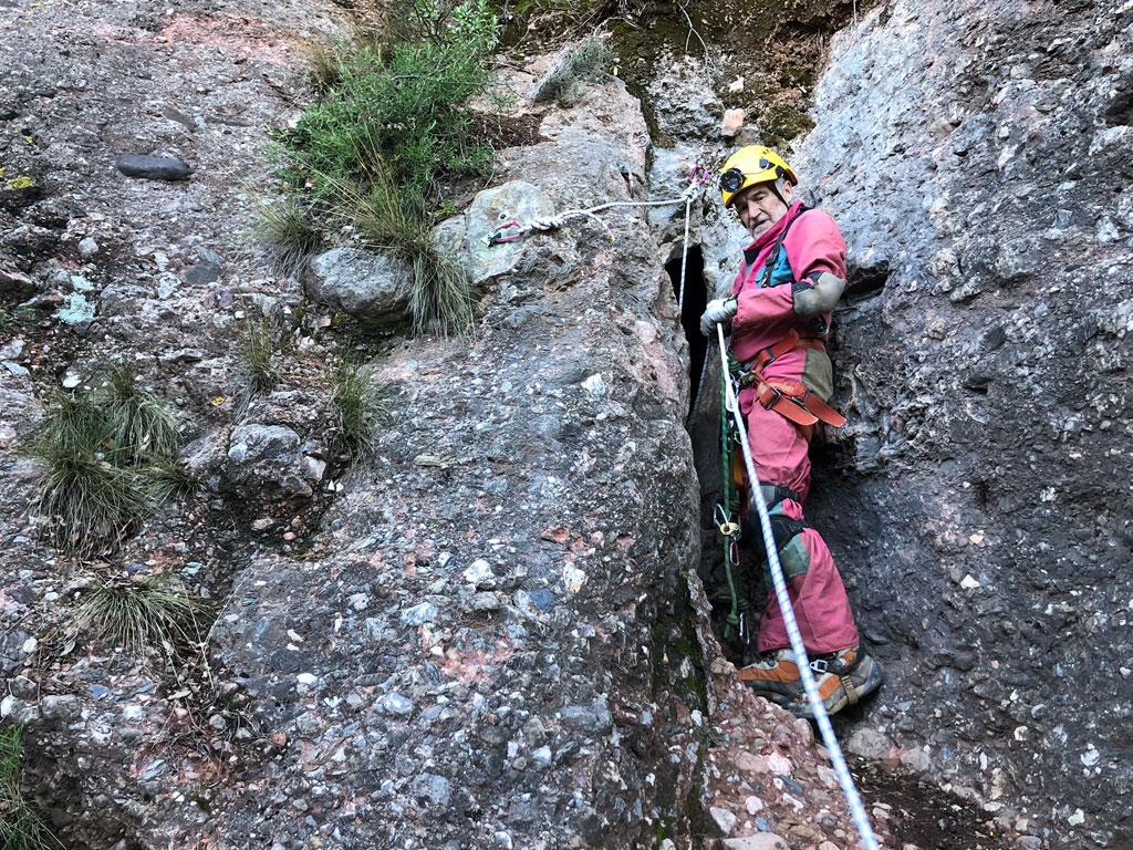 Vam trobar-nos uns químics nous instal·lats al exterior i que assumint un lleuger fregament de la corda, permeten baixar obviar la reinstal·lació de la capçalera del pou que hi ha a l'interior.