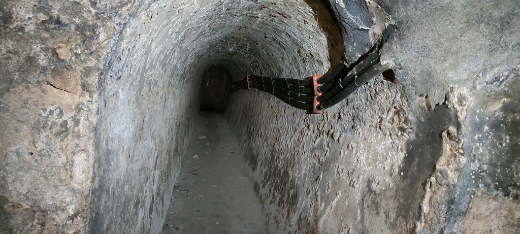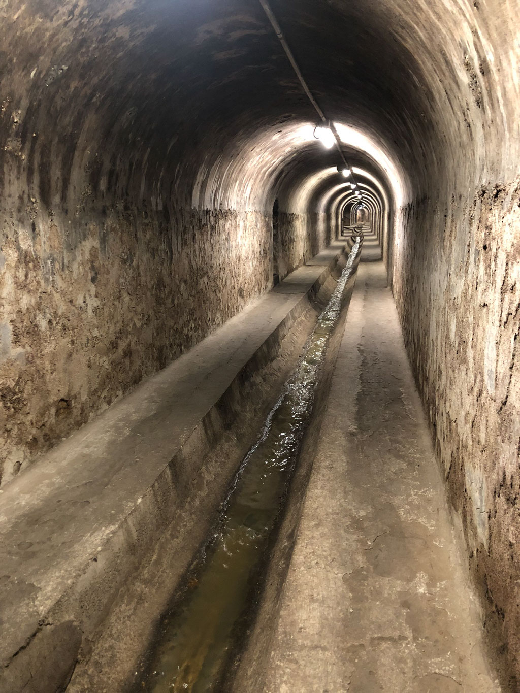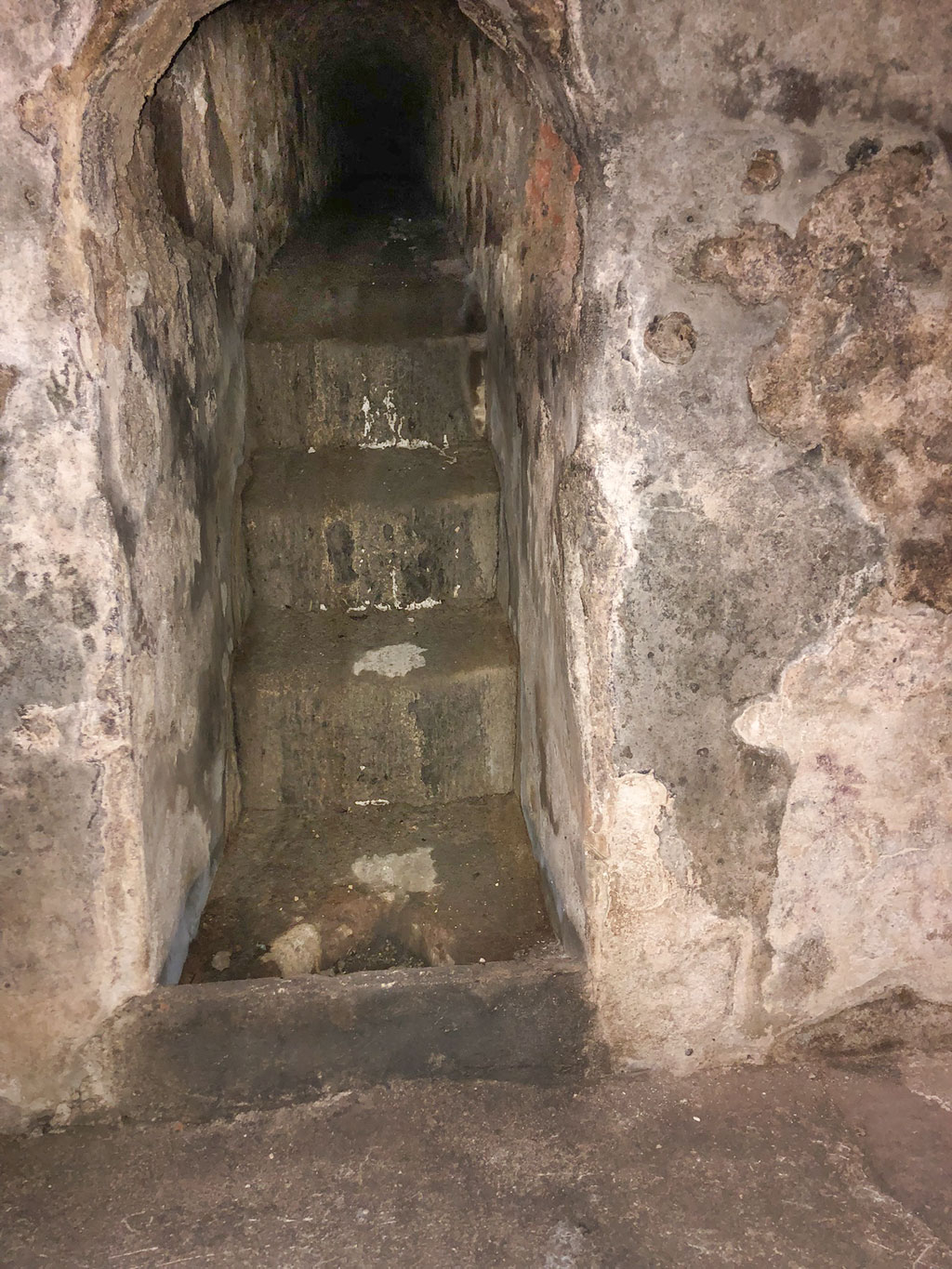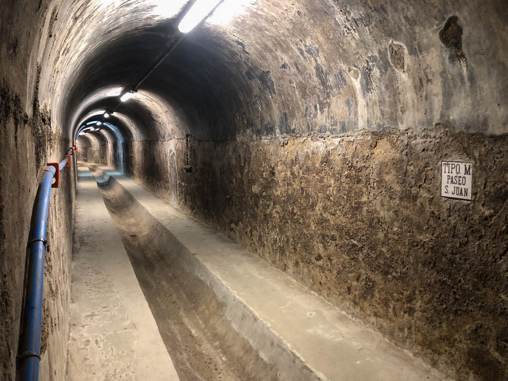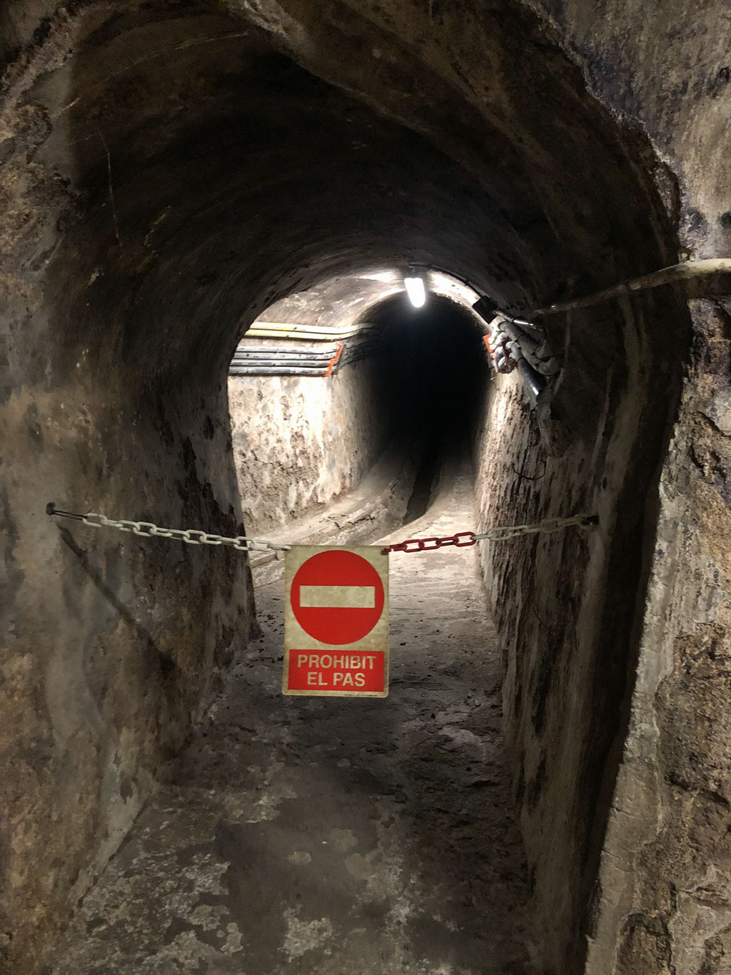 Aixequen una tapa que hi ha a l'acera i baixem per unes escales d'obra, seguim per una galeria amb el sostre una mica baix i ja hi som.