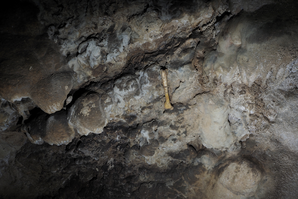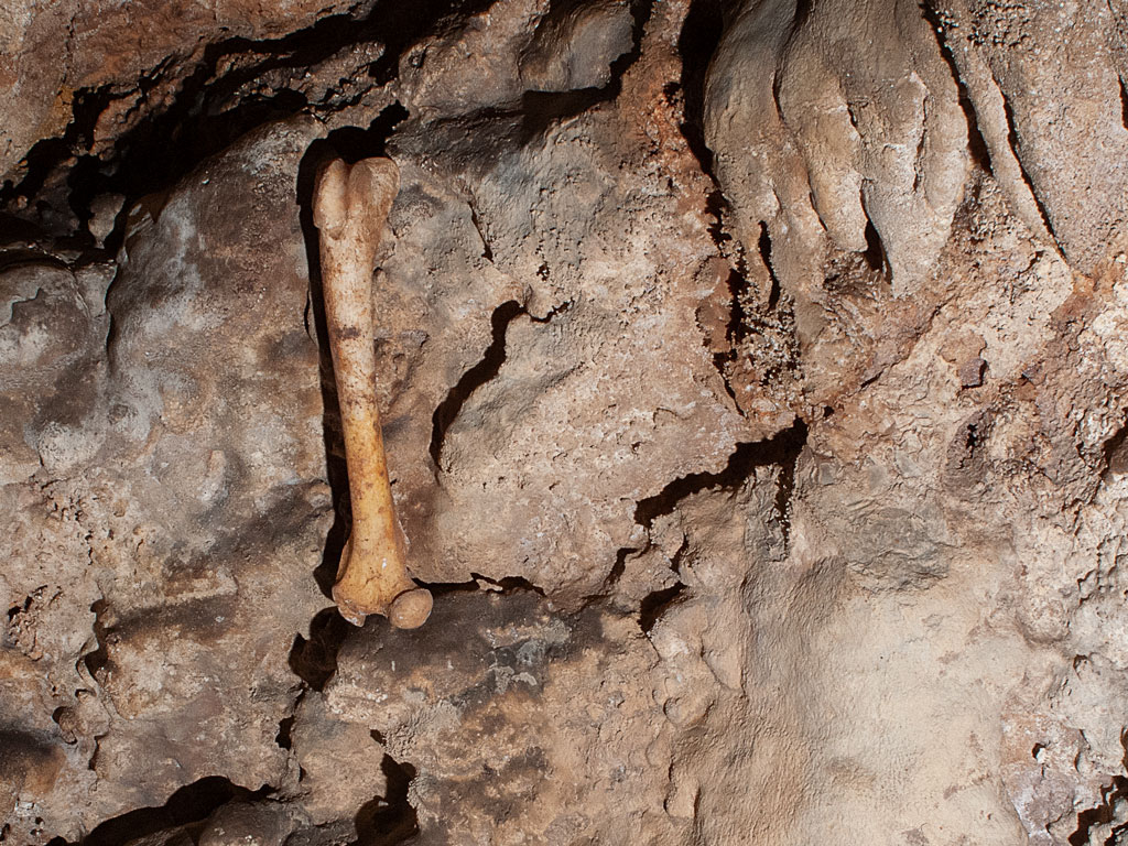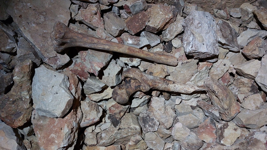 Un parell d'ossos humans trobats en el fons de la Grallera de Corona, en el Montsec d'Ares.