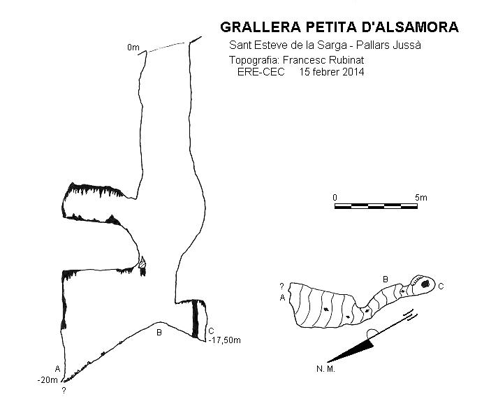 La grallera té una boca d’entrada de 5 x 2m., amb una vertical de 8m, seguida per una rampa amb petits ressalts que ens portarà al pou de 55m. amb una instal·lació en un sostre totalment penjada.